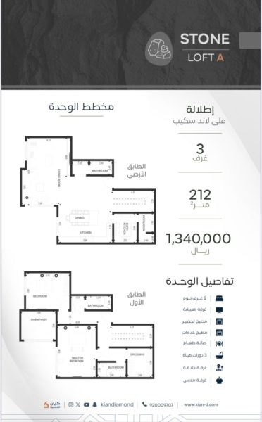 لوفت وحدة سكنية مكونة من طابقين بمساحات واسعة واسقف مرتفعة و إطلالة على لاند سكيب . مشروع يجمع بين الراحة والفخامة والرفاهية . موقع مميز ومواصفات مميزة متكاملة الخدمات . نوادي رياضية ، لاونج ، مجالس ، مساحات عمل مشتركة، مصلى ، ماركت ذكي ، مداخل فندقية ، إطلالة بانورامية .